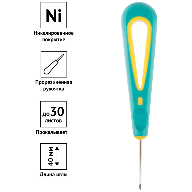Канцелярское шило используется для прошивки документов и прокалывания бумаги. Оснащено крючком. Пластиковая прорезиненная рукоятка (составная, зеленый + желтый). Диаметр иглы 2 мм, длина иглы 40 мм, никелированное покрытие. Общая длина 140 мм, обеспечивает прокалывание до 30 листов бумаги.