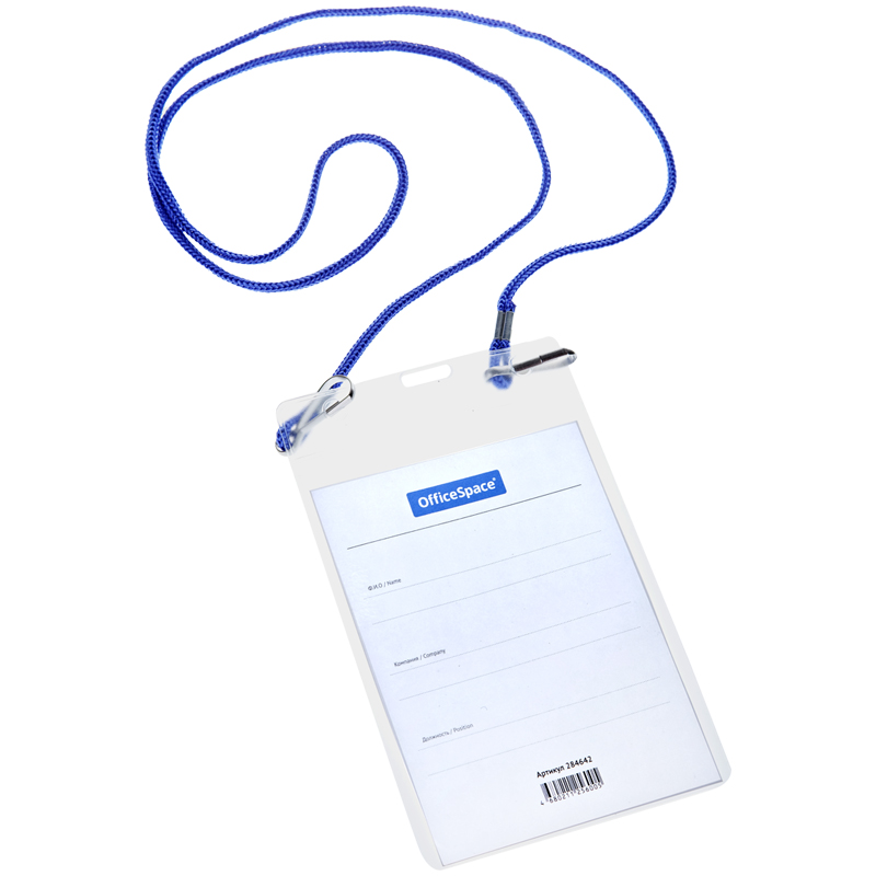 Бейдж вертикальный из мягкого прочного пластика. Съемный текстильный шнурок крепится к бейджу с помощью двух карабинов.
