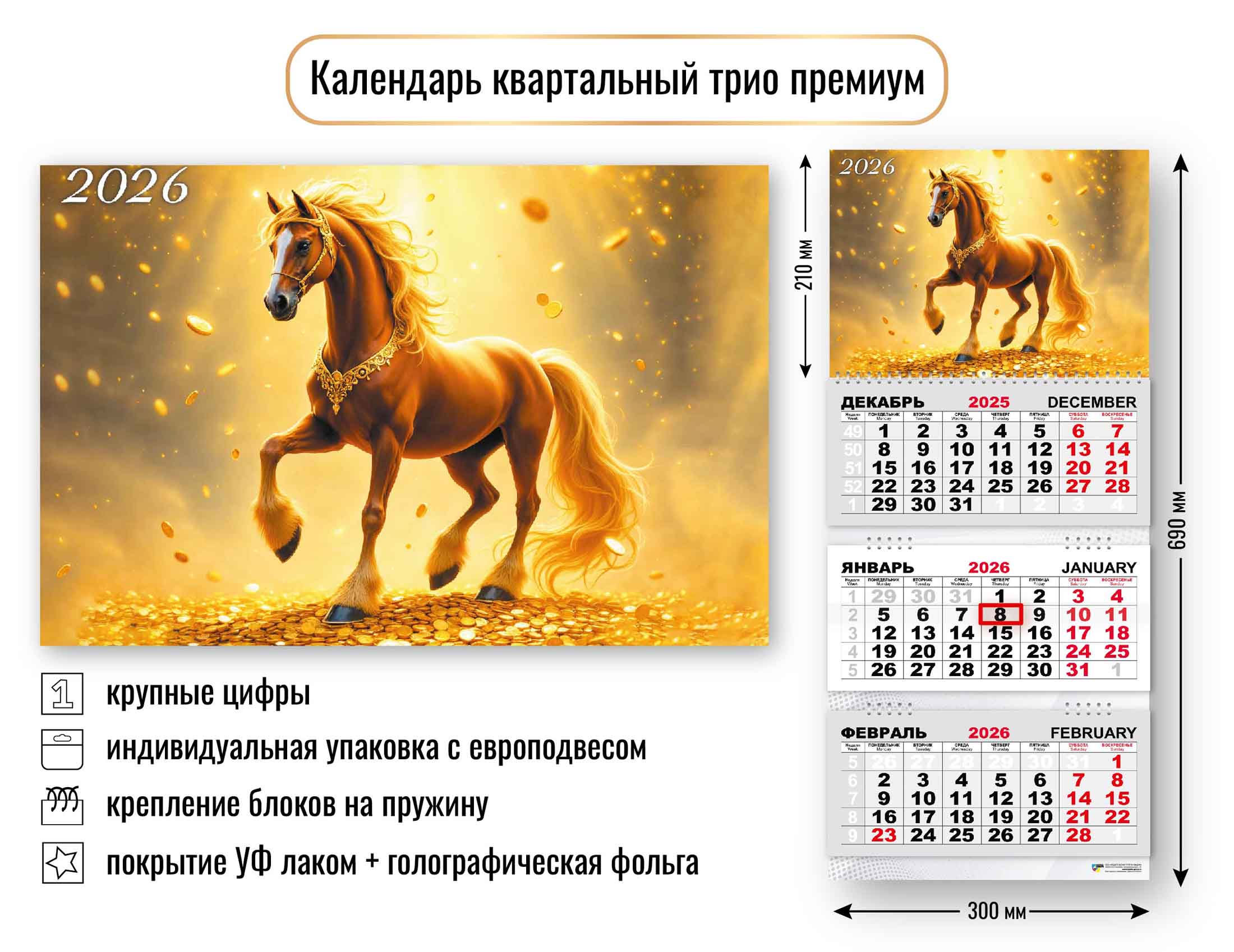 Календарь квартальный 2026г 3-х блочный на 3-х гребнях, бегунок, "Символ года", премиум (Квадра)