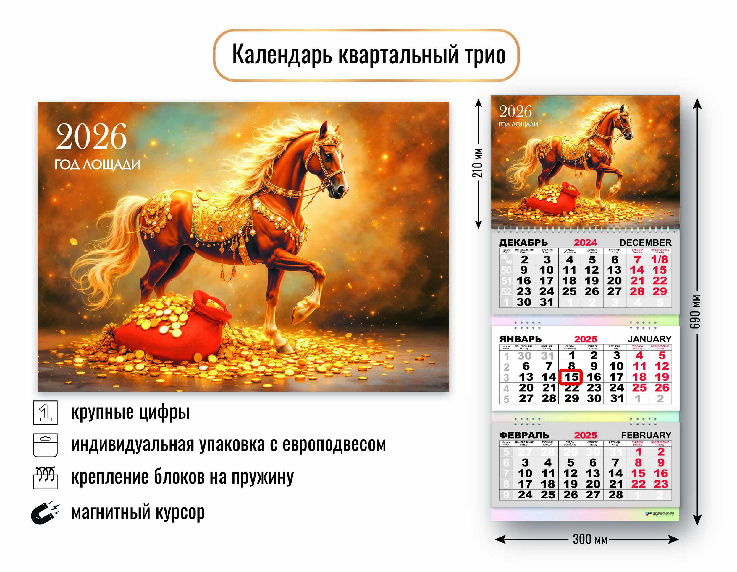 Календарь квартальный 2026г 3-х блочный на 3-х гребнях, магнитный бегунок, "Символ года" (Квадра)