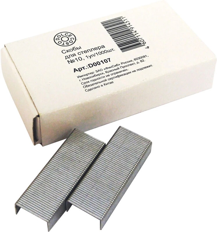 ОписаниеОбзоры Скобы для степлера №10 металлические оцинкованные, 1000 штук в белой картонной упаковке. Предназначены для степлеров со сшивающей способностью до 16 листов.