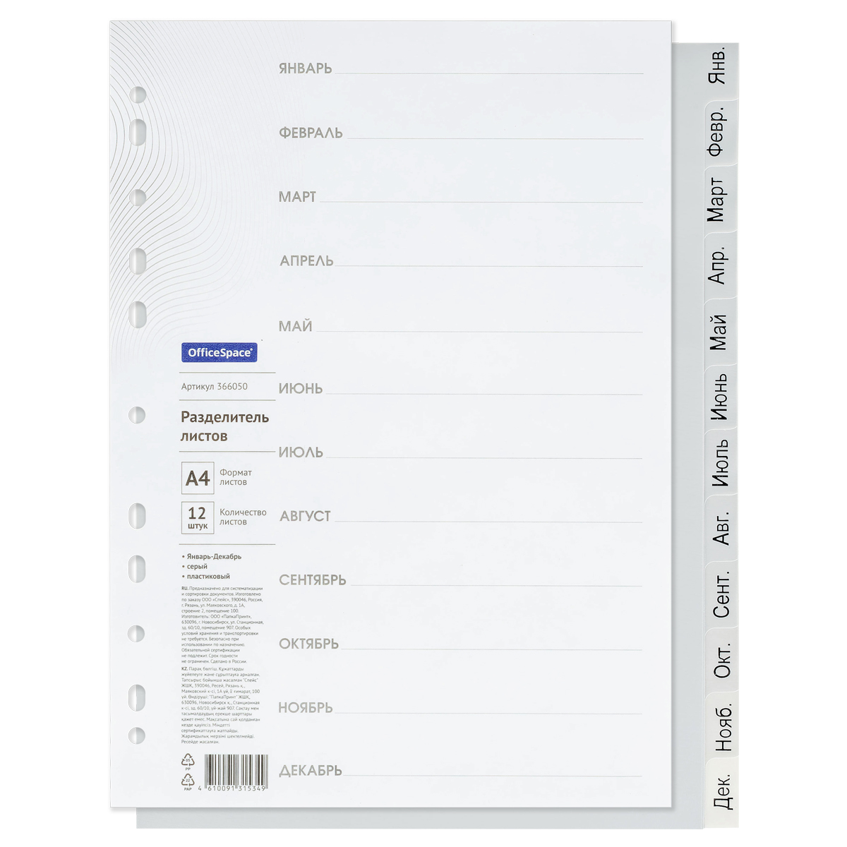 В комплект входят 12 листов серого цвета, обеспечивающих возможность сортировки документов по месяцам, а также титульный лист для оглавления.