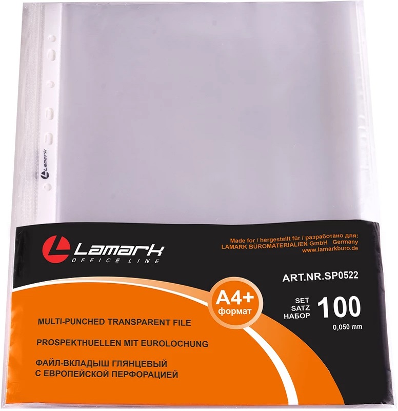 ОписаниеОбзоры Файлы-вкладыши Lamark А4+ глянцевые выполнены из высококачественной полипропиленовой пленки толщиной 0,050 мм, снабжены универсальной перфорацией, предназначены для хранения и транспортировки неперфорированных документов, 100 штук в упаковке