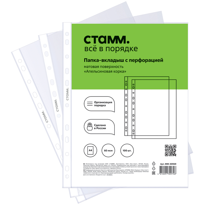 Папка-вкладыш с перфорацией «СТАММ» отлично подойдет хранения и систематизации документов. Папка размером 305*235 мм изготовлена из полипропилена толщиной 60 мкм. Папка вмещает до 50 листов. Имеет текстуру "апельсиновая корка", защищает листы от внешних воздействий. Перфорация на боковой части позволяет разместить изделие в папке с любым кольцевым механизмом или скоросшивателе. Упакованы в пакет по 100 штук.