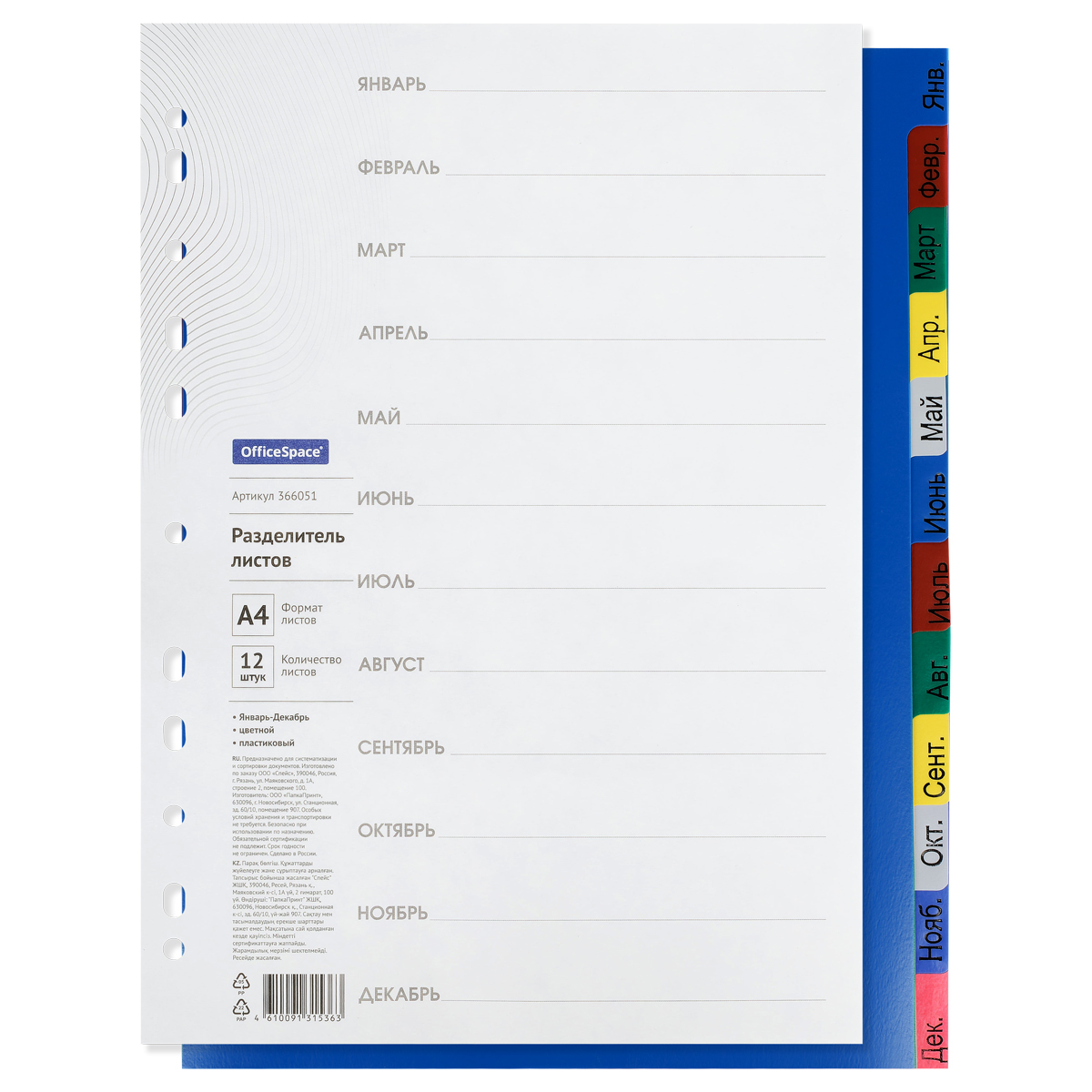 Пластиковые разделители листов OfficeSpace предназначены для сортировки и систематизации документов внутри папок, обеспечивают сохранность и аккуратность листов. Изготовлены из пластика толщиной 120 мкм. Размер 224*297 мм. В комплект входят 12 листов синего, красного, серого, зеленого и желтого цвета, обеспечивающих возможность сортировки документов по месяцам, а также титульный лист для оглавления. Удобны в использовании, перфорация позволяет подшивать разделители во все типы папок.